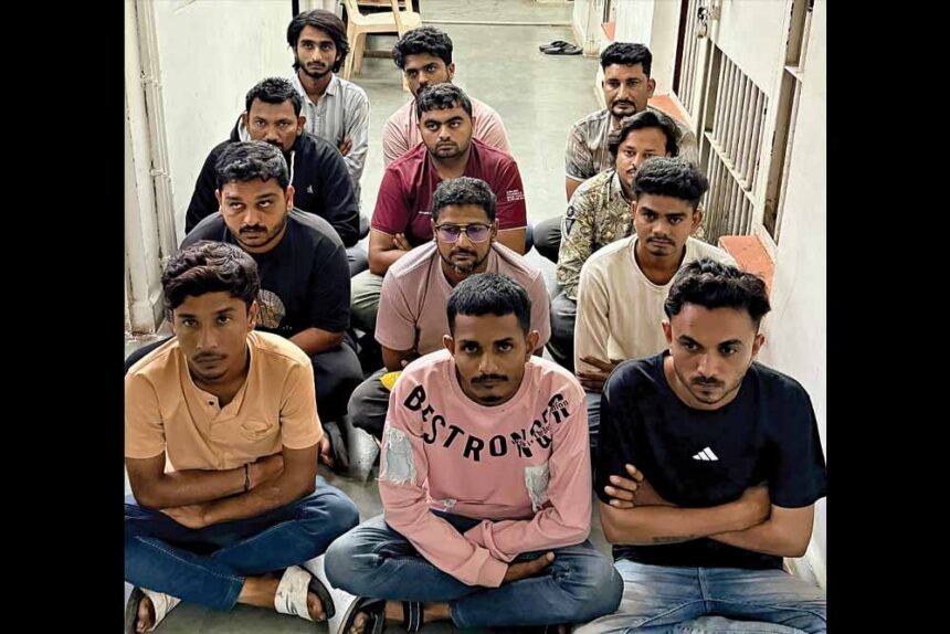 કોડીનાર તાલુકાના વેલણ ગામના લાઈટ હાઉસ પાસેના દરિયાકાંઠેથી ગત તા.27ના રોજ પોલીસે 5.43 લાખનો શરાબનો જથ્થો પકડીને ત્રણ શખ્સોની ધરપકડ કરી હતી પકડાયેલા શખ્સોના મોબાઈલ કોલ ડિટેલ ઉપરથી કોડીનાર પોલીસે ગીર સોમનાથ જિલ્લાના ઇતિહાસમાં પ્રથમ વખત જ આ શરાબ કાંડ સાથે સંકળાયેલા અન્ય 21 સામે નામ જોગ ફરિયાદ દાખલ કરી હતી બાકી રહેલા 18 પૈકી 12 શખ્સોને રાજકોટ એલસીબી ઝોન 2 પીએસઆઈ રામદેવસીહ ઝાલા અને ટીમે શાસ્ત્રીમેદાન પાસેથી દબોચી લીધા છે પોલીસે કોડીનારના મોસીન ઓસમાણભાઈ હાલાઇ, નાથાભાઈ લખમણભાઈ સોલંકી, શેલેષભાઈ ઉર્ફે બચ્ચો જગુભાઈ કામળીયા,જુબેર હાજીભાઈ પણાવટુ, અજય ઉર્ફે જાડી મોહનભાઈ ભરડા,કલ્પેશ ઉર્ફે કલુ લખમણભાઈ વાજા, અર્જુન લાખાભાઈ રાઠોડ, મોહીતભાઈ પ્રકાશભાઇ વંશ, જયેશભાઈ ભુપતભાઈ રાઠોડ, અજયભાઈ ઉર્ફે બકરી બાબુભાઈ કામળીયા, અરફાન ઉર્ફે જીણી પાડી હારુનભાઈ પાણાવટુ, સતીષભાઈ અરજણાભાઈ કામળીયાની ધરપકડ કરી કોડીનાર પોલીસને સોંપી દીધા છે આ કેસમાં 5 શખસો અને 3 અજાણ્યા હોડી વાળા પોલીસ પક્કડથી દૂર હોય જેને પકડવા પોલીસે ચક્રો ગતિમાન કર્યા છે.