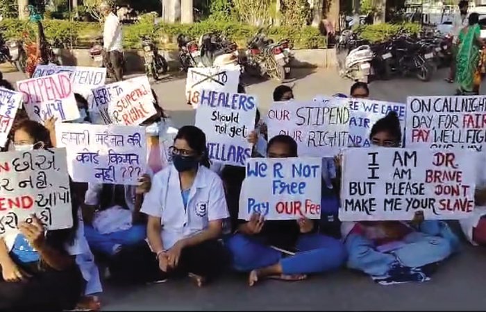અમરેલી શાંતાબા જનરલ હોસ્પિટલના 121 ઇન્ટર ડોક્ટરોએ સ્ટાયફંડ વધારવા માટે અગાઉ અનેક રજૂઆતો કરવામા આવી છે. કલેકટરને પણ લેખિત રજૂઆત કરાઇ હતી. પરંતુ ઇન્ટર ડોક્ટરોનું સ્ટાયફંડ બાબતે કોઈ હકારાત્મક જવાબ મળ્યો નથી. ત્યારે આજે હોસ્પિટલના પટાંગણમા તમામ ઇન્ટર ડોકટરો કામથી વંચિત રહી કોઈ યોગ્ય નિર્ણય નહિ આવે ત્યાં સુધી હડતાળ ઉપર ઉતર્યા હતાં. હાલ તેઓનું સ્ટાયફંડ 10 હજાર જેવું છે જે સરકારના નિયમો પ્રમાણે 18 હજાર બસો કરવાની માંગ સાથે નારાઓ લગાવી હોસ્પિટલના પટાંગણમાં જ હડતાળ ઉપર બેસી ગયા છે.