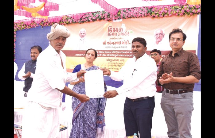 સુરેન્દ્રનગરના નાના કાંધાસર ખાતે કૃષિ વિજ્ઞાન કેન્દ્રમાં જિલ્લા કક્ષાનો કિસાન સન્માન સમારોહ યોજાયો. જિલ્લા વિકાસ અધિકારી કે. એસ. યાજ્ઞિકના અધ્યક્ષસ્થાને યોજાયેલા આ કાર્યક્રમમાં વડાપ્રધાન નરેન્દ્ર મોદી અને મુખ્યમંત્રી ભૂપેન્દ્ર પટેલે વર્ચ્યુઅલ માધ્યમથી ઉદબોધન કર્યું હતું. કાર્યક્રમમાં કૃષિલક્ષી વિવિધ યોજનાઓ અંતર્ગત 15 ખેડૂત લાભાર્થીઓને રૂ. 77 લાખથી વધુની સહાયનું વિતરણ કરવામાં આવ્યું હતું. જિલ્લા વિકાસ અધિકારીએ જણાવ્યું કે, નર્મદાના નીર પહોંચતા જિલ્લાના ખેડૂતો સિંચાઈ ક્ષેત્રે પ્રગતિ કરી રહ્યા છે. પ્રાકૃતિક ખેતીના પ્રચાર-પ્રસારથી જિલ્લામાં 41 હજારથી વધુ ખેડૂતોએ પ્રાકૃતિક ખેતી અપનાવી છે.