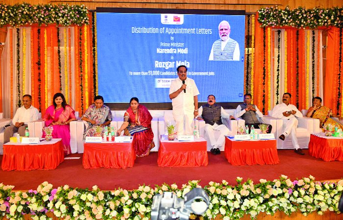 દેશમાં 51,000 કર્મચારીને નિયુક્તિ પત્રો એનાયત કરવામાં આવ્યા હતા. વડાપ્રધાન નરેન્દ્ર મોદીએ વીડિયો કોન્ફરન્સ માઘ્યમથી કહ્યુ કે, ધનતેરસના દિવસે નિયુક્તિ પત્રો મેળવનારા 51,000 યુવાનોને અભિનંદન. આ વખતે દિવાળી વિશેષ છે. 500 વર્ષ બાદ પ્રભુ શ્રીરામ ભવ્ય મંદિરમાં બિરાજમાન થયા છે અને આ પ્રથમ દિવાળી છે. વડોદરામાં ડિફેન્સ સેક્ટર માટે એર ક્રાફટ બનાવનારી ફેકટરીનુ ઉદઘાટન કર્યુ છે, જેનાથી નોકરીના અવસર અને એર ક્રાફટના સ્પેર પાર્ટ બનાવતા નાના ઉદ્યોગકારોને ફાયદો થશે. પહેલાની સરકારમાં નીતિ અને નિયતનો અભાવ હતો. જર્મની દર વર્ષે 90,000ને વિઝા આપશે. ભારતના લોકો 21 દેશોમાં માઈગ્રેટ થઈ શકે છે. રાજકોટના કાર્યક્રમમાં હાજર સી. આર. પટીલે જણાવ્યું હતું કે, આજે ધનતેરસના દિવસે નિમણૂક પત્રો મળ્યાં તે યુવાનોને અભિનંદન આપુ છું. અગાઉ સરકારી નોકરી મેળવવા માટે ખૂબ જ તકલીફ પડતી હતી. અનેક ગરબડ થતી હતી, જેને લીધે મેરીટમાં રહેલા ઉમેદવારો સિલેક્ટ થતા ન હતા. જોકે, વડાપ્રધાન નરેન્દ્ર મોદી દ્વારા દેશમાં 40 જગ્યાએથી 51,000 યુવાનોને નોકરી આપવામાં આવી રહી છે, ત્યારે તેમાં કોઈ ગરબડ થતી નથી. જેમાં રાજકોટ શહેરમાં આજે પોસ્ટ વિભાગનાં નવનિયુક્ત 83 અને રેલવેના 2 કર્મચારીને નિમણૂક પત્રો એનાયત કરવામાં આવ્યા હતા.