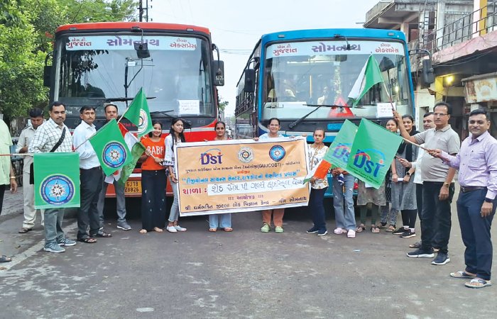 ગીર સોમનાથ જિલ્લાનાં વિદ્યાર્થીઓ અને શિક્ષકોમાં વિજ્ઞાન અને ટેકનોલોજી પ્રત્યે અભિરૂચી વધે અને જીજ્ઞાસાવૃતિ કેળવાય તે હેતુસર ગુજરાત કાઉન્સિલ ઓન સાયન્સ એન્ડ ટેકનોલોજી (ગુજકોસ્ટ), વિજ્ઞાન અને પ્રૌદ્યોગિકી વિભાગ ગુજરાત સરકારના સહયોગથી ધર્મભક્તિ જિલ્લા લોક વિજ્ઞાન કેન્દ્ર દ્વારા વિનામૂલ્યે રિજિયોનલ સાયન્સ સેન્ટરની મુલાકાત કરાવવાનું આયોજન કરવામાં આવ્યું છે. જે અન્વયે શેઠ એમ.પી. ગર્લ્સ હાઇસ્કુલ માધ્યમિક તથા ઉચ્ચતર માધ્યમિક વેરાવળની વિદ્યાર્થીનીને રિજીયોનલ સાયન્સ સેન્ટર રાજકોટની મુલાકાત માટે જિલ્લા શિક્ષણ અધિકારી એમ.પી.બોરીચા તથા આચાર્ય રાજેશભાઈ એ.ડોડીયાના માર્ગદર્શન હેઠળ તેમજ મુકેશભાઈ ચોલેરા (સામાજિક અગ્રણી તથા ડાયરેક્ટર વેરાવળ પીપલ્સ બેંકના વરદ હસ્તે ફ્લેગઓફ આપી જિલ્લાની પ્રથમ બસનું પ્રસ્થાન કરાવવામાં આવ્યું હતું.
