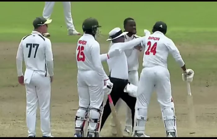 રિપોને તુલીના બોલ પર એક શક્તિશાળી છગ્ગો ફટકાર્યો. પછી બોલર અને બેટ્સમેન એકબીજા સામે જોવા લાગ્યા. જોકે, જ્યારે રિપન ક્રીઝ પર પાછા ફરવા માટે વળ્યો, ત્યારે તુલીએ બાંગ્લાદેશી બેટ્સમેનનો કોલર પકડીને તેને ધક્કો માર્યો.