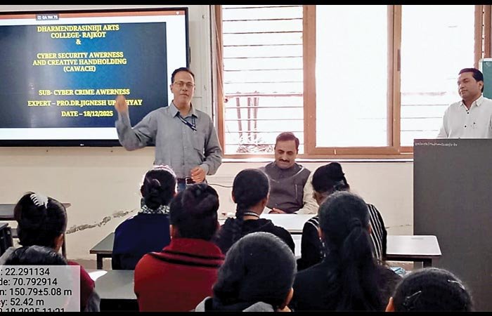 રાજકોટની પ્રખ્યાત ધર્મેન્દ્રસિંહજી આર્ટસ કોલેજના સાયબર સિક્યુરિટી સેલ ‘કવચ’ દ્વારા 18 ડિસેમ્બરના રોજ “સાયબર ગુનાઓ અંગે જાગૃતિ” વિષય પર વિશેષ કાર્યક્રમનું આયોજન કરવામાં આવ્યું હતું. પ્રવર્તમાન સમયમાં વધતા જતા સાયબર ક્રાઈમ સામે વિદ્યાર્થીઓ અને સમાજ જાગૃત બને તેવા મુખ્ય ઉદ્દેશ્ય સાથે યોજાયેલા આ કાર્યક્રમમાં મોટી સંખ્યામાં વિદ્યાર્થીઓ અને અધ્યાપકો ઉપસ્થિત રહ્યા હતા.