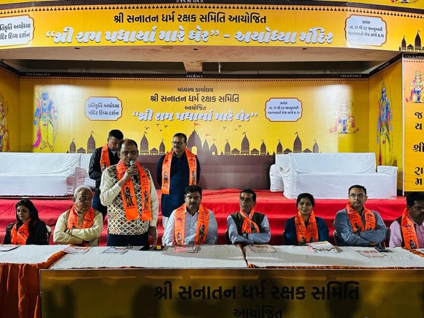 આપણા ભારત રાષ્ટ્રમાં અયોધ્યાનગરી કે જેની સાથે કરોડો હિન્દુઓની આસ્થા જોડાયેલી છે ત્યાં આગામી તા. 22 જાન્યુઆરી 2024ના રોજ મર્યાદા પુરુષોતમ શ્રીરામ બિરાજીત થવા જઈ રહ્યા છે. હાલ અયોધ્યાનગરી મધ્યે મર્યાદા પુરુષોત્તમ ભગવાન શ્રીરામના ભવ્ય અને દિવ્ય મંદિરનું નિર્માણકાર્ય પૂરજોશમાં ચાલી રહ્યું છે ત્યારે આ ઘડીની વાટ આખું રાષ્ટ્ર જોઈ રહ્યું છે. આ દિવ્ય અને ભવ્ય મહોત્સવની તૈયારીઓ આખા દેશમાં ચાલી રહી છે ત્યારે રાજકોટ શહેરમાં તા. 17 જાન્યુઆરી 2024થી 22 જાન્યુઆરી સુધી શ્રી સનાતન ધર્મ રક્ષક સમિતિ દ્વારા પણ એક ભવ્ય મહોત્સવનું ‘રામ મેદાન’, વિરાણી હાઈસ્કૂલ ગ્રાઉન્ડ ખાતે આયોજન કરવામાં આવનાર છે.