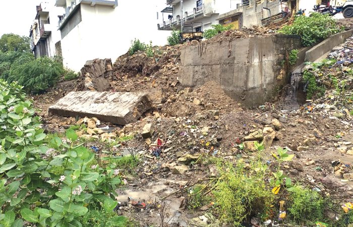 બિલખામાં સામાન્ય વરસાદમાં પંચાયત દ્વારા બનાવામાં આવેલી પૂર સંરક્ષણ દિવાલ ધરાશાયી