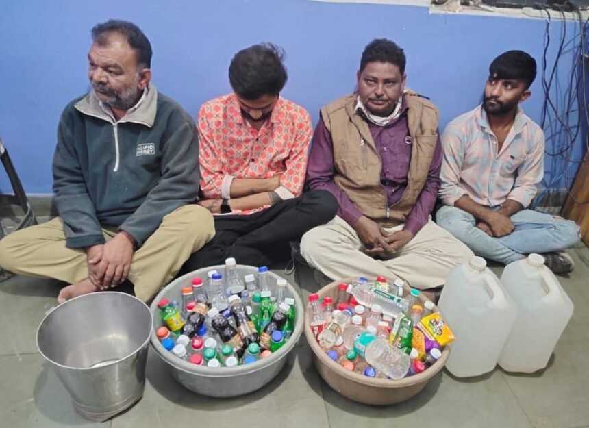 દારૂનો ધંધાર્થી પ્રવીણ ઉર્ફે સીતારામ તેમજ દારૂ પીવા આવેલા રાહુલ જીવા પરમાર, યશ વિજય ભાડેશિયા, હેમંત રણછોડ લીંબડિયાને પકડી પાડી 105 લિટર દેશી દારૂ, નાની સોડાની 50 બોટલ વગેરે મળી કુલ રૂ.2350નો મુદ્દામાલ કબજે કર્યો છે. દારૂનો ધંધાર્થી પ્રવીણ ઉર્ફે સીતારામ દેશી દારૂમાં ફ્લેવર ભેળવી પ્યાસીઓને વેચતો હતો. તેમજ પ્યાસીઓને બેસવાની અને નાસ્તાની સુવિધાઓ પણ પૂરી પાડતો હતો. પોલીસના દરોડા સમયે ઘરમાંથી કંઇ હાથ ન લાગે તે માટે પ્રવીણ ઉર્ફે સીતારામે અગાશી પર પ્યાસીઓને બોલાવી સુવિધાઓ પૂરી પાડતો હોવાની કેફિયત આપી હતી.