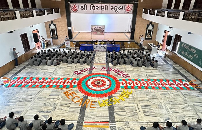 રક્ષાબંધનના પવિત્ર તહેવાર નજીક હોય તે નિમિત્તે વિરાણી હાઈસ્કૂલ ખાતે આજે એક અનોખી ઉજવણી કરવામાં આવી હતી. શાળાના વિદ્યાર્થીઓએ 45 ફૂટ લાંબી અને 200 ચોરસ ફૂટથી પણ વધુ મોટી રાખડી બનાવીને સૌનું ધ્યાન આકર્ષિત કર્યું હતું. આ કાર્યક્રમમાં વિદ્યાર્થીઓએ ઉત્સાહપૂર્વક ભાગ લીધો હતો, અને આ વિશાળ રાખડી બનાવીને ભાઈ-બહેનના પવિત્ર સંબંધની ઉજવણી કરી હતી.