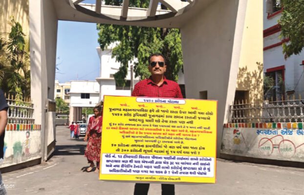 જાગૃત નાગરીકની વેદના: મહાપાલિકા કચેરી સામે બેનર લઇ જવાબો માંગ્યા