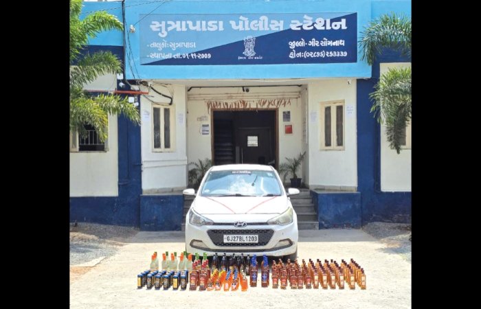 સુત્રાપાડા પોલીસે બળેવલા ગામના વડલીના પાટીયા નજીકથી ભારતીય બનાવટની વિદેશી દારૂની અલગ અલગ બ્રાન્ડની બોટલો નંગ-165 તથા બીયર ટીન નંગ-24 મળી રૂ. 1,14,570 તથા હેરાફેરીમાં ઉપયોગ લીધેલ હ્યુન્ડાઈ કંપનીની આઇ-20 મોટર કાર રૂ.3 લાખ મળી કુલ રૂ.4,14, 570 નો પ્રોહિનો મુદામાલ ઝડપી લીધેલ છે જયારે લોઢવા ગામના બે બુટલેગરોને ઝડપવા ચક્રો ગતિમાન કરેલ છે. સુત્રાપાડાના પોલીસ ઇન્સ્પેક્ટર એન.બી. ચૌહાણ ના માર્ગદર્શન હેઠળ સ્ટાફ પેટ્રોલીંગમાં રહેલ તે દરમ્યાન બાતમી મળેલ જેમાં જયેશ ઉર્ફે મુરલી સરમણભાઈ વાળા રહે.લોઢવા તા.સુત્રાપાડા તથા હીતેશ ઉર્ફે ડાડો જેસાભાઈ વાઢેર, રહે લોઢવા, તા.સુત્રાપાડા બન્ને ઈંગ્લીશ દારૂના જથ્થાની હેરાફેરી કરે છે અને એક હ્યુન્ડાઈ આઈ-20 મોટર કાર નંબર જી.જે. 27 એ.બી. 1203 માં ઈંગ્લીશ દારૂના જથ્થાવાળી ગાડી બળેવલા ગામના વડલીના પા નામની સીમમાં વિદેશી દારૂની હેરફેર કરવાના હોય જે સ્થળે પહોંચી ગાડીમાં ચેક કરતા (1) ભારતીય બનાવટનો વિદેશી દારૂની ઇમ્પીરીયલ બ્લ્યુ હેન્ડ પેક્ડ ગ્રેઈન વ્હિસ્કી 750 એમએલની બોટલો નંગ 12 રૂા.13,200 (2) ભારતીય બનાવટનો રોયલ ચેલેન્જ ફીટનેશ પ્રીમીયમ વ્હીસ્કી બોટલો નંગ-08 રૂ.10,800 (3) ભારતીય બનાવટનો મેજીક મુમેટ ઓરેન્જ ફલેવર વોડકા 750 એમ.એલ ની બોટલો નંગ-10 રૂા.12,000 (4) ભારતીય બનાવટનો મેજીક મુમેટ ગ્રીન એપલ ફ્લેવર વોડકા 750 એમ.એલ.ની બોટલો નંગ-12 બોટલો નંગ-12 રૂ.14,400 (5) ભારતીય બનાવટનો ટેગ પ્રીમીયમ લેગર બીયર 540 એમ.એલ ની કાંચની કાંચની બોટલ બીયર નંગ-09 રૂ.1890 (6) ભારતીય બનાવટનો ટેગ પ્રીમીયમ લેગર બીયર 500 એમ.એલ.ના ટિનના કેન નંગ-24 રૂા.4080 (7) ભારતીય બનાવટનો રોયલ ચેલેન્જ ફીટનેશ પ્રીમીયમ વ્હીસ્કી 375 એમ.એલ.ની બોટલો નંગ 39 રૂા.25,350 (8) ભારતીય બનાવટનો રોયલ સ્ટગ ક્લાસીક વ્હીસ્કી 375 એમએલની બોટલો નંગ-43 રૂ.27,950 (9) ભારતીય બનાવટનો વિદેશી દારૂની કીમપીસ સ્પેશીયલ વ્હીસ્કી 180 એમ એલના પ્લાસ્ટીકના ક્વાટરીયા નંગ-15 રૂા.1500 (10) ભારતીય