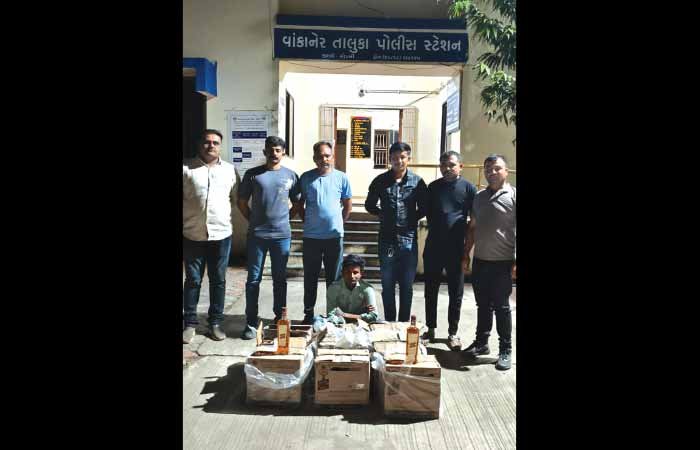 કારની તલાશી લેતા તેમાંથી ભારતીય બનાવટના વિદેશી દારૂની કુલ 220 બોટલો મળી આવી હતી. પોલીસે સ્થળ પરથી આરોપી રાહુલભાઈ ગોપાલભાઈ ચુડાસમા (રહે. ધર્મનગર, મોરબી) ની ધરપકડ કરી હતી, જ્યારે બીજો આરોપી કાળુભાઈ અબ્રાહમભાઈ સુમરા (રહે. લાખચોકીયા, ચોટીલા) ફરાર થવામાં સફળ રહ્યો હતો. પોલીસે દારૂની બોટલો (કિંમત ₹55,000), કાર (કિંમત ₹1,00,000) અને મોબાઈલ ફોન સહિત કુલ ₹1,60,000 નો મુદ્દામાલ કબ્જે કર્યો છે. વાંકાનેર તાલુકા પોલીસે બંને આરોપીઓ વિરુદ્ધ પ્રોહિબિશન એક્ટ હેઠળ ગુનો નોંધીને ફરાર આરોપીને ઝડપી લેવા માટે વધુ તપાસ હાથ ધરી છે.