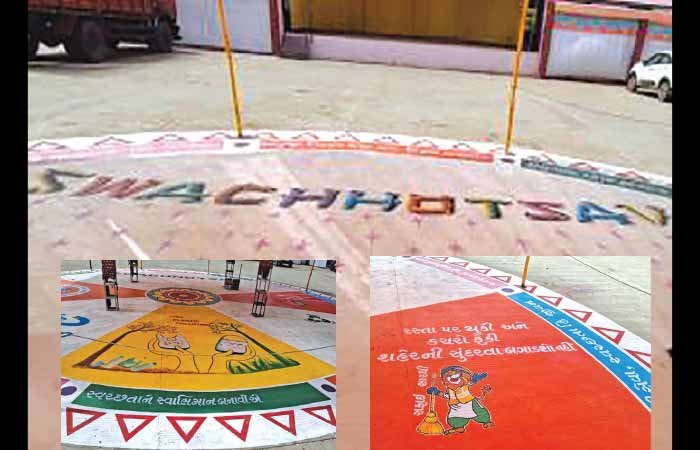 વાંકાનેર નગરપાલિકા દ્વારા સ્વચ્છતા હી સેવા અભિયાન અંતર્ગત ટાઉનહોલ ખાતે મુખ્ય ગરબી મંડળના ગરમી ચોકમાં સ્વચ્છતાની થીમ સાથે સ્વચ્છોત્સવ રંગોળી દોરવામાં આવી છે.