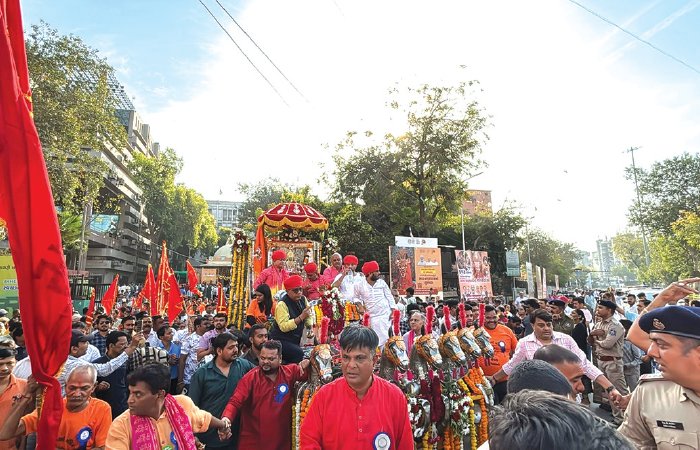 અમદાવાદના લાલ દરવાજામાં આવેલા ભદ્ર પરિસરમાં જયઘોષ સાથે ભક્તિમય માહોલ જોવા મળી રહ્યો છે. ભક્તોના હાથમાં લાલ ધજા જોવા મળી રહી છે. કારણ કે 614 વર્ષના ઈતિહાસમાં આજે પહેલીવાર અમદાવાદમાં મા ભદ્રકાળી નગરયાત્રાએ નીકળ્યાં છે.