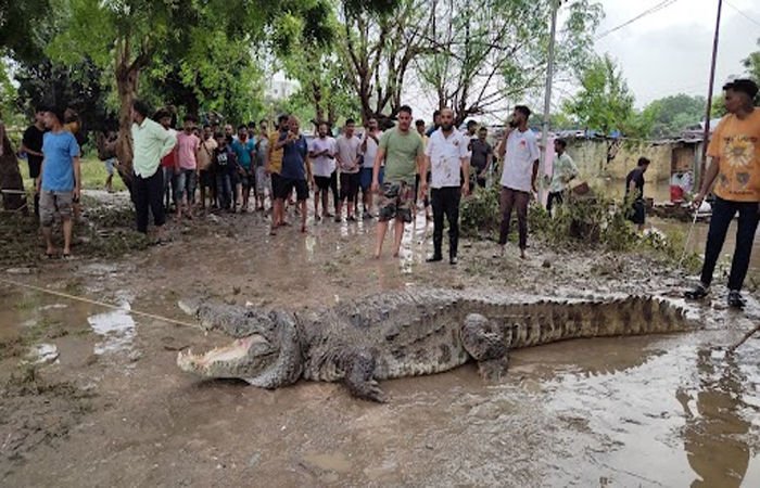 પૂરના પાણી ઓસર્યા બાદ વડોદરાવાસીઓ માટે નવી આફત આવી પડી છે. વડોદરામાં અવસર પાર્ટી પ્લોટ સામે રોડ પર મહાકાય મગર આવી ગયો હતો. 10 ફૂટના મગરને ઘુંટણસમા પાણીમાંથી રેસ્કયુ કરવામાં આવ્યો હતો. ત્યારે બીજી તરફ ફતેહગંજ વિસ્તારમાં રહેણાંક ઘરમાં કદાવર મગર ઘૂસી ગયો હતો. કદાવર મગર પૂરના પાણીમાં તણાઈ આવ્યો હતો. નદીના પ્રવાહ સાથે તણાઈને આવેલો મગર રહેણાંક ઘરમાં ઘૂસી ગયો હતો.