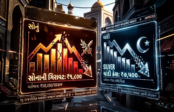 મિડલ ઈસ્ટમાં ચાલતા યુદ્ધ અને વૈશ્વિક તણાવની વચ્ચે સોના-ચાંદીના ભાવમાં અચાનક મોટો ઘટાડો જોવા મળ્યો છે, જેનાથી રોકાણકારો હેરાન છે. સામાન્ય રીતે અશાંતિના સમયમાં સોના-ચાંદીને સુરક્ષિત રોકાણ માનવામાં આવે છે અને તેના ભાવ વધતા હોય છે, પરંતુ આ વખતે બજાર ખુલતાની સાથે જ કિંમતી ધાતુઓના ભાવમાં મોટો કડાકો જોવા મળ્યો છે. સોમવારે ચાંદીના ભાવમાં એકાએક 7,500 રૂપિયા અથવા 2.53% સુધીનો મોટો ઘટાડો નોંધાયો છે, જ્યારે સોનું પણ પ્રતિ 10 ગ્રામ 1800 રૂપિયાથી વધુ સસ્તું થયું છે.