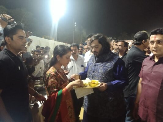 જૂનાગઢ જિલ્લાનું ચોરવાડ ગામ ધિરુભાઈ અંબાણીનું માદરે વતન અને કર્મ ભુમીમાં ગઈકાલ અંબાણી પરિવાર દ્વારા અનંત અંબાણી અને રાધિકા અંબાણી લગ્ન પ્રસંગની ઉત્સાહ અને ઉમંગ સાથે ઉજવણી કરવામાં આવી હતી જેમાં સમગ્ર ગ્રામજનો માટે ભવ્ય ભોજન સમારંભ સાથે લોકસાહિત્ય સંસ્કૃતિ સભર લોકડાયરાનું ભવ્ય આયોજન કરવામાં આવ્યું હતું ત્યારે અંબાણી પરિવાર સાથે નવ દંપતી અનંત અને રાધિકાએ ચોરવાડી માતાજીના દર્શન કરીને આશીર્વાદ લીધા હતા. જામનગરમાં અનંત અને રાધિકાનું પ્રિવેડિંગ લગ્ન પ્રસંગે દેશ દુનિયાની હસ્તીઓ અને સેલિબ્રિટીની ઉપસ્થિતિમાં લગ્ન પ્રસંગ ભવ્ય રીતે ઉજવાયા બાદ ધિરુભાઈના માદરે વતન ચોરવાડમાં ગઈકાલ અંબાણી પરીવાર પધાર્યા હતા અને ગ્રામજનોને મળીને આશીર્વાદ લીધા હતા અને સમગ્ર ગ્રામજનો માટે ભવ્ય ભોજન સમારંભ સાથે કિર્તીદાન ગઢવી સહીત નામાંકિત કલાકારો દ્વારા લોકડાયરોનું આયોજન કરાયું હતું.