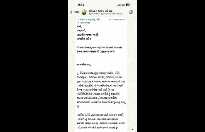 રાજકોટ શહેરના રાજકીય વર્તુળોમાં આજે એક મહત્વપૂર્ણ રાજીનામાથી ચર્ચાઓનો માહોલ ગરમાયો છે. ભારતીય જનતા પાર્ટીના બક્ષીપંચ મોરચાના ઉપપ્રમુખ તરીકે ફરજ બજાવતા દિનેશભાઇ ધનજીભાઈ કણજારીયાએ પાર્ટીના તમામ હોદ્દા તેમજ પ્રાથમિક સભ્યપદમાંથી તાત્કાલિક અસરથી રાજીનામું આપ્યું છે. દિનેશભાઇ કણજારીયાએ તેમના રાજીનામા પત્રમાં સ્પષ્ટ આક્ષેપ કર્યો છે કે સતવારા સમાજને છેલ્લા ઘણા વર્ષોથી ચૂંટણી પ્રક્રિયામાં યોગ્ય પ્રતિનિધિત્વ આપવામાં આવ્યું નથી. વારંવાર અવગણના થતી હોવાના કારણે આ નિર્ણય લેવાયો હોવાનું તેમણે જણાવ્યું છે. આ નિવેદનથી સ્થાનિક રાજકીય પરિસ્થિતિમાં નવી ચર્ચાઓને વેગ મળ્યો છે. કણજારીયા પાર્ટીમાં વિવિધ હોદ્દાઓ પર રહી કાર્ય કરી ચૂક્યા છે અને હાલ તેઓ બક્ષીપંચ મોરચાના ઉપપ્રમુખ તરીકે સક્રિય હતા. તેઓ ગાંધીગ્રામ સતવારા સમાજના માજી પ્રમુખ અને સતવારા મહામંડળ ગુજરાતના પૂર્વ કારોબારી તરીકે પણ જાણીતા છે. તેમના રાજીનામાથી ખાસ કરીને સતવારા સમાજમાં રાજકીય પ્રતિનિધિત્વ અંગે પ્રશ્ર્નો ઉઠવા લાગ્યા છે. તેમણે પત્રના અંતમાં પાર્ટીમાં કામ કરવાની તક મળવા બદલ આભાર વ્યક્ત કર્યો હતો અને આગળના સમયમાં ભાજપ વધુ પ્રગતિ કરે તેવી શુભેચ્છાઓ પાઠવી હતી. રાજકીય નિરીક્ષકો માને છે કે આ રાજીનામું માત્ર વ્યક્તિગત નિર્ણય નથી, પરંતુ તેમાં સામાજિક અસંતોષની છાપ પણ સ્પષ્ટ દેખાઈ રહી છે. આવનારા સમયમાં આ મુદ્દો વધુ ઉગ્ર બને તેવી સંભાવનાઓ વ્યક્ત કરવામાં આવી રહી છે.