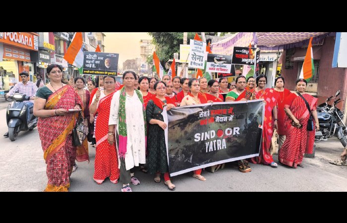 જૂનાગઢ ભાજપ અધ્યક્ષ ગૌરવ રૂપારેલિયાની સુચનાથી મહાનગર મહિલા મોરચાનાં અધ્યક્ષ જ્યોતીબેન વાડોલીયાનાં માર્ગદર્શન હેઠળ સૈનિકોનાં હોસલાને વધારવા તથા આપણા આદરણીય પ્રધાનમંત્રી નરેન્દ્રભાઇ મોદીની સંપૂર્ણ દેખરેખ હેઠળ ઓપરેશન સિંદુરમાં જે સફળતા પ્રાપ્ત કરી તથા ભારતીય સેનાના શૌર્યને બિરદાવા માટે બહેનોએ લાલ સાડી તથા ડ્રેસ પહેરીને શહીદ પાર્કથી ડો.બાબાસાહેબ આંબેડકરજીની પ્રતિમા કાળવા ચોક સુધીની સિંદુર યાત્રાનુ આયોજન કરવામાં આવ્યું હતું. જેમાં મહિલા મોરચાનાં મહામંત્રી શીતલબેન તન્ના, ભાવનાબેન વ્યાસ, સ્ટેન્ડિંગ કમિટી ચેરમેન પલવીબેન ઠાકર, આદ્યશક્તિબેન મજમુદાર, ગીતાબેન પરમાર, કનકબેન વ્યાસ, યોગેશ્વરીબા જાડેજા, મનિષાબેન વૈશ્નાણી, વંદનાબેન દોશી, ગીતાબેન મહેતા, સુનિતાબેન સેવક, શારદાબેન કોટડીયા, કૈલાસબેન વેગડા, ભાવનાબેન માળી, જીજ્ઞાબેન દેસાઈ, પૂજાબેન કારીયા, પ્રવિણાબેન વાઘેલા વિવિધ મહિલા મંડળના અગ્રણીઓ સખી મંડળના બહેનો મહિલા કોર્પોરેટર અને વિવિધ સંસ્થાઓમાંથી અનેક આગેવાન બહેનો ઉપસ્થિત રહ્યા હતા તેમ મિડિયા વિભાગનાં સંજય પંડ્યાની યાદી જણાવે છે.