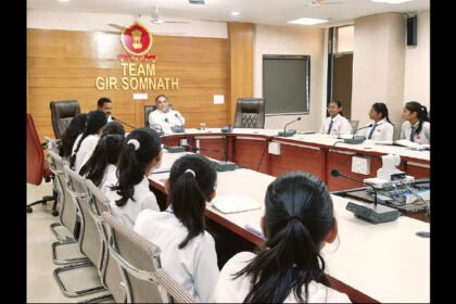 તાલાલા તાલુકાનાં ઘુંસિયા ગામની ડી.એસ.સી.પબ્લિક સ્કૂલની વિદ્યાર્થી બહેનોએ કલેકટરની શુભેચ્છા મુલાકાત કરી