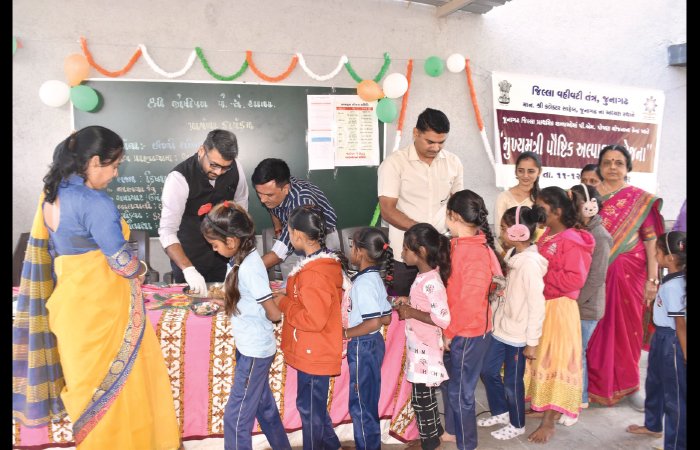 એમ.ટી.ડોડીયા દ્વારા શાળાના બાળકોને મુખ્યમંત્રી પોષ્ટિક અલ્પાહાર યોજનાનું મહત્વ સમજાવી પોષ્ટિક આહારની સમજ આપી હતી. આ યોજનાનું જિલ્લાના 10 તાલુકાની કુલ 714 સરકારી અને ગ્રાન્ટ-ઈન-એઈડ પ્રાથમિક શાળાઓના બાલવાટિકા થી ધો.-8 સુધીના કુલ 79,312 વિદ્યાર્થીઓને પી.એમ. પોષણ યોજનામાં આપવામાં આવતા બપોરના ભોજન ઉપરાંત શાળામાં શૈક્ષણિક કાર્ય શરૂ થાય તે પહેલા પ્રાર્થના સમયે મુખ્યમંત્રી પૌષ્ટિક અલ્પાહાર યોજના દ્વારા કેલરી પ્રોટીન યુક્ત પૌષ્ટિક અલ્પાહાર આપવામાં આવેલ. જે અન્વયે તાલુકાના મામલતદારશ્રી તમામ, નાયબ મામલતદાર તમામ, સુપરવાઇઝર દ્વારા પી.એમ. પોષણ યોજનાના કેન્દ્રોની મુલાકાત લઈ ઉપરોક્ત યોજનાનો જિલ્લાના તમામ કેન્દ્રો ખાતે શુભારંભ કરવામાં આવ્યો હતો.