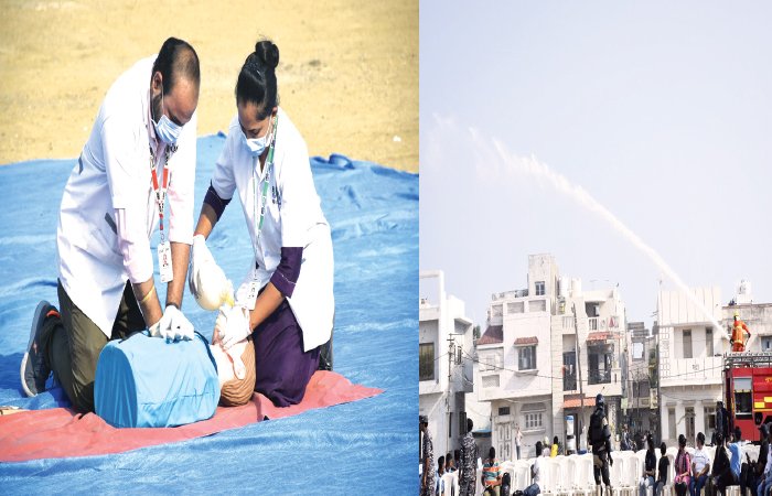 આરોગ્ય વિભાગ દ્વારા કાર્ડિયોપલ્મોનરી રીસસીટેશન (સી.પી.આર) અંતર્ગત ચેસ્ટ કમ્પ્રેસન, શ્વાસ કેવી રીતે આપવો? જેવી જીવ બચાવનારી પ્રક્રિયાઓ વિશે માહિતગાર કરાયા હતાં. ફાયર વિભાગ દ્વારા ખૂબ જ ટૂંકા સમયમાં સ્થળ પર પહોંચી આગ કેવી રીતે બૂઝાવી શકાય તે અંગે ‘મોનિટર દ્વારા ફાયર ફાઈટિંગ’ તાદ્રશ્ય કરાયું હતું.