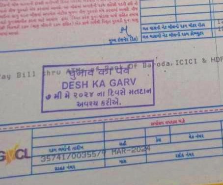 જિલ્લા ચૂંટણી અધિકારીશ્રી કે.ડી. લાખાણીના માર્ગદર્શન હેઠળ મતદાન જાગૃતિ અભિયાનને વધુ વેગ આપી વીજ બિલમાં મતદાન જાગૃતિનો સિક્કો લગાવીને આ અભિયાનને સાર્થક કરવામાં આવી રહ્યું છે. લોકસભા સામાન્ય ચૂંટણીની અન્વયે નાગરિકોને મતદાન માટે જાગૃત કરવા વિવિધ વિભાગો દ્વારા પ્રયત્નો કરવામાં આવી રહ્યાં છે. આ કામગીરી સ્વીપ હેઠળ થઈ રહી છે. જિલ્લામાં વધુમાં વધુ મતદાન થાય તે માટે મતદાન કરવા માટે મતદારોમાં જાગૃતિ આવે તે માટે પોરબંદર પીજીવીસીએલની પેટા વિભાગીય કચેરીઓ દ્વારા એપ્રિલ મહિનાના 1,10,645 જેટલા વીજ બિલોમાં વીજ બિલ પર ‘મતદાન અવશ્ય કરીશ’ નો સિક્કો લગાવીને મતદાન કરવાં અપીલ કરવામાં આવી છે.