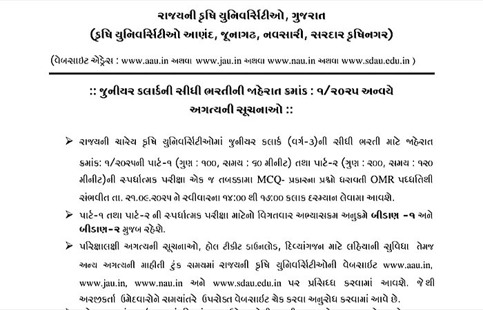 રાજ્યની 4 કૃષિ યુનિવર્સિટીઓમાં જુનિયર ક્લાર્કની ભરતી પ્રક્રિયાને લઈને ઉમેદવારોમાં ભારે અસંતોષ જોવા મળી રહ્યો છે. જાણકારી મુજબ જુનિયર ક્લાર્કની કુલ 227 જગ્યા માટે પ્રિલિમ્સ અને મેઈન્સ બંને પરીક્ષા એક જ દિવસે 21 સપ્ટેમ્બર-2025એ ગોઠવવાની સંભાવના છે. સામાન્ય રીતે પ્રિલિમ્સ બાદ પરિણામ જાહેર થાય છે અને ત્યારબાદ મેઈન્સ માટે પૂરતો સમય આપવામાં આવે છે, પરંતુ આ વખતે એક જ દિવસે બંને પરીક્ષા ગોઠવવાના નિર્ણયથી ઉમેદવારો તૈયારી અંગેના ન્યાયની માગણી કરી રહ્યા છે. પરંતુ સૌથી મહત્ત્વની બાબત એ છે કે, આ ભરતી પ્રક્રિયાની પ્રિલિમ્સ પરીક્ષા અને મુખ્ય પરીક્ષા બંને એક જ દિવસમાં લેવાશે. 100 માર્કની પ્રિલિમ્સ અને 200 માર્કની મેઈન સહિત કુલ 300 માર્કની પરીક્ષા વિદ્યાર્થીએ એક જ દિવસમાં આપવાની રહેશે. સામાન્ય રીતે સ્પર્ધાત્મક પરીક્ષા લેતી સરકારની અન્ય સંસ્થાઓ પહેલા પ્રિલિમ્સ પરીક્ષા લે છે, તેનું પરિણામ આપે છે, બાદમાં મેઈન્સ પરીક્ષા લે છે. મેઈન્સ માટે તૈયારી કરવા માટે વિદ્યાર્થીઓને સમય પણ મળે છે, પરંતુ કૃષિ યુનિવર્સિટીની ભરતીમાં બંને પરીક્ષા એકસાથે જ ગોઠવાતા ઉમેદવારોમાં આક્રોશ ફેલાયો છે. એવી જ રીતે પ્રિલિમ્સ પરીક્ષામાં ઉત્તિર્ણ થનાર ઉમેદવારોની મુખ્ય પરીક્ષા પણ એ જ દિવસે લઇ લેવામાં આવશે. મુખ્ય પરીક્ષા પણ 200 માર્કની એમસીક્યૂ આધારીત લેવાશે. પરંતુ બન્ને પરીક્ષા વચ્ચે ઉમેદવારોને સમય નહીં અપાતાં આક્રોશ ફેલાયો છે.
