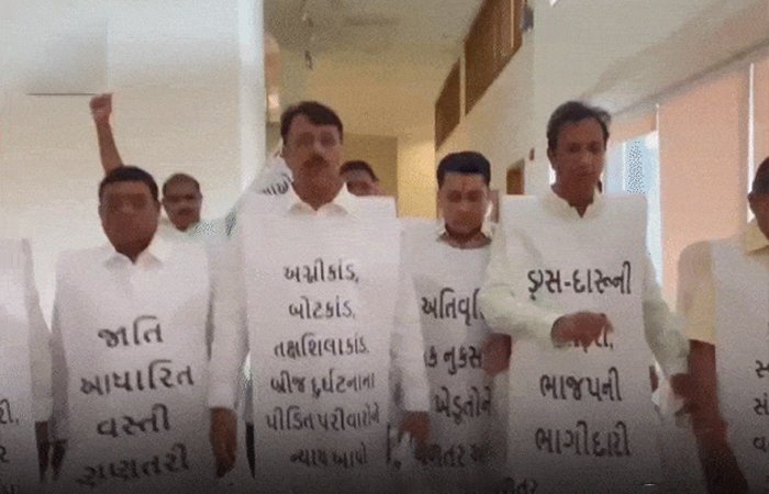ગુજરાત વિધાનસભામાં ચોમાસું સત્ર ચાલી રહ્યું છે આ દરમિયાન હવે એક મોટા સમાચાર સામે આવ્યા છે. વિધાનસભા અધ્યક્ષ દ્વારા કોંગ્રેસના ધારાસભ્યોને ગૃહમાંથી એક દિવસ માટે સસ્પેન્ડ કરવામાં આવ્યા છે. આજે ટૂંકી મુદ્દતના પ્રશ્નો રદ્દ થવા બાબતે કોંગ્રેસ પક્ષ દ્વારા પ્રશ્ન ઉઠાવાયા હતા. આ સાથે બેનર સાથે ગૃહમાં દેખાવો કર્યા બાદ કોંગ્રેસ પક્ષના ધારાસભ્યોએ વોક આઉટ કર્યુ હતું. જે બાદમાં વિધાનસભા અધ્યક્ષ દ્વારા ગૃહમાં મતદાન દ્વારા કોંગ્રેસ પક્ષના ધારાસભ્યોને એક દિવસ માટે સસ્પેન્ડ કરવામાં આવ્યા છે.