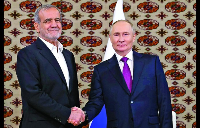 રશિયન પ્રમુખ વ્લાદિમીર પુતિન અને ઈરાન પ્રમુખ મસૂદ પેજેશકિયન પહેલી વખત તુર્કમેનિસ્તાનના અશ્ર્ગાબાતમાં શુક્રવારે મળ્યા. બંને નેતાઓએ પશ્ર્ચિમ એશિયાની તાજેતરની સ્થિતિ પર પણ ચર્ચા કરી. મળતી જાણકારી અનુસાર બંને દેશોના મધ્ય ડ્રોન અને અન્ય સુરક્ષા ઉત્પાદનને લઈને 1.7 અબજ ડોલરના નિકાસ કરાર પણ થયા છે. પુતિને ખુલીને ઈરાનનું સમર્થન કર્યુ અને ઈઝરાયલને ચેતવણી આપતાં પુતિને કહ્યું કે, ‘ઈરાન પર હુમલો કરવાનું સાહસ કરતા નહીં.’