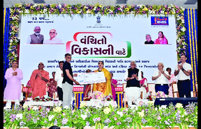 ભરૂચ ખાતે વિકાસ સપ્તાહ અંતર્ગત યોજાયેલા વંચિતો વિકાસની વાટે કાર્યક્રમ દરમિયાન 12.85 લાખ લાભાર્થીઓને રૂા. 383.54 કરોડની સહાય ડિબીટી મારફત ચૂકવાઇ પ્રધાનમંત્રી નરેન્દ્રભાઇ મોદીએ જાહેર જીવનમાં પુરા કરેલા 23 વર્ષના ઉપલક્ષમાં રાજયભરમાં યોજાઇ રહેલા વિકાસ સપ્તાહ કાર્યક્રમ અંતર્ગત ભરૂચના શ્રી નિલકંઠ સભાખંડ, બી.એ.પી.એસ સ્વામીનારાયણ મંદિર, ઝાડેશ્વર ખાતે મધ્ય અને દક્ષિણ ગુજરાતના સામાજીક ન્યાય અને અધિકારિતા વિભાગના નિગમો અને સમાજ સુરક્ષા વિભાગની યોજનાના લાભાર્થીઓને સહાય આપવા માટે યોજાયેલા