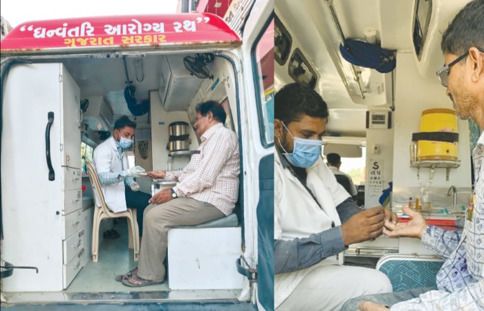 ગુજરાત સરકાર દ્વારા લોકોના આરોગ્ય અને તેમની સુખાકારીના વધારો માટે સતત પ્રયત્નો કરવામાં આવે છે. જેમાં ગુજરાત સરકાર અને EMRI GREEN HEALTH SERVICES દ્વારા મેડિકલ ટીમ સાથેના આરોગ્ય રથ ચલાવવામાં આવે છે. જે સ્થળ પર જઈને જ લોકોને ફ્રી ઓપીડીની સેવા પૂરી પાડે છે. ધનવંતરી આરોગ્ય રથ- બાંધકામ સાઇટસ્ અને શ્રમિક વસાહતોમાં સારવાર આપે છે. જ્યારે મોબાઈલ મેડિકલ અને હેલ્થ યુનિટ અંતરિયાળ ગામો તથા નેસ વિસ્તારમાં સારવાર આપે છે અને શ્રમયોગી આરોગ્ય સંજીવની GIDC વિસ્તાર અને કંપનીમાં કાર્ય કરતાં શ્રમિકોને મફત હેલ્થ ચેકઅપ કરી આપી દવાઓ પૂરી પાડે છે. જેના માટે ક્યારેય પણ કોઈ પ્રકારનો ચાર્જ લેવામાં આવતો નથી.
