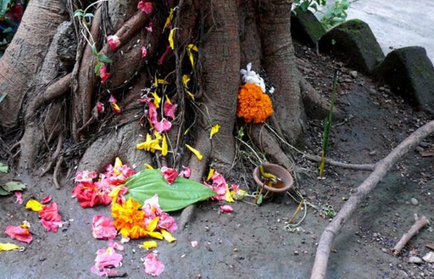મંદિરમાંથી મળેલા ફૂલોને ઝાડ પાસે રાખો