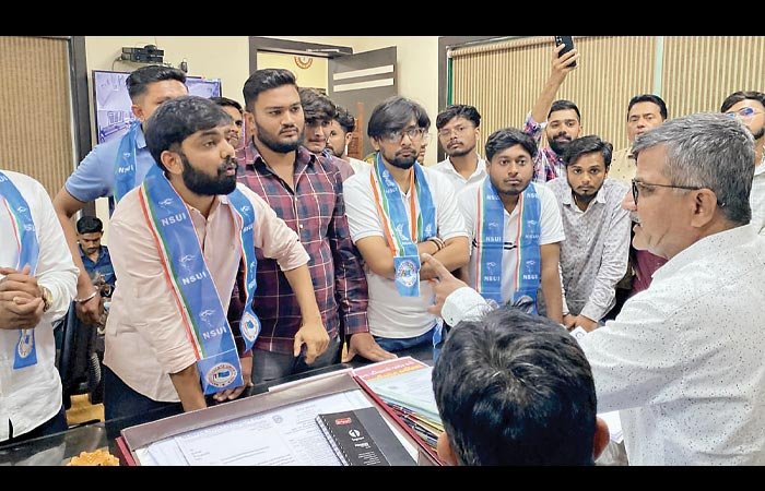 ગજઞઈંના કાર્યકરોએ કુલપતિ ઉત્પલ જોશીને આવેદન પાઠવી રજૂઆત કરી: વિદ્યાર્થીઓના હિતમાં નિર્ણય નહીં લેવામાં આવે તો ગાંધી ચીંધ્યા માર્ગે આંદોલન