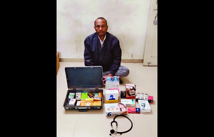 આજીડેમ પોલીસ મથકના પીઆઈ એ. બી.જાડેજાની રાહબરીમાં પીએસઆઇ જે. જી.રાણા ટીમ પેટ્રોલિંગમાં હતાં ત્યારે સ્ટાફના કોન્સ્ટેબલ દેવા ધરજીયા, સંજય બારોટ, દિવ્યરાજસિંહ જાડેજાને બાતમી મળી હતી કે ત્રંબા ગામમાં, મેઈન બજારમાં નામ વગરનું કલીનીક આવેલ છે, જે દવાખાનામાં જીગર મોલીયા નામનો શખ્સ કોઇપણ જાતની ડીગ્રી વગર લોકોને જોઈ તપાસી દવા આપી તથા બાટલા ચઢાવી લોકોના આરોગ્ય સાથે ચેડા કરે છે આ ચોક્કસ બાતમી આધારે સ્ટાફે દરોડો પાડી રાજકોટની કોઠારીયા કોલોનીમાં રહેતા જીગર વલ્લભભાઈ મોલીયા ઉ.41ને સકંજામાં લઈ મેડીકલ પ્રેકટીશ કરવા અંગે ડીગ્રી સર્ટીફીકેટ બાબતે પૂછતાં મેડિકલ સર્ટી નહી હોવાનુ જણાવેલ અને પોતે બી.કોમ. સુધીનો અભ્યાસ કરેલ હોવાનુ જણાવેલ હતું. ઉપરાંત કબૂલાત આપતા જણાવ્યું હતું કે દર્દીઓને તપાસી એલોપેથીક દવાઓ આપે છે તેમજ ઇન્ડોર પેસન્ટ તરીકે દર્દીઓને બાટલા ચઢાવી સારવાર કરે છે. તેમજ રાજકોટમાં ખાનગી હોસ્પિટલમાં કમ્પાઉન્ડર તરીકે કરેલ નોકરીના અનુભવથી આઠ મહિનાથી દવાખાનું ખોલી લોકોના આરોગ્ય સાથે ચેડાં કરતો હતો પોલીસે ધરપકડ કરી અલગ અલગ પ્રકારની દવાઓ અને સાધનો મળી કુલ રૂ.12620 નો મુદામાલ કબ્જે કરી કાર્યવાહી કરી હતી.