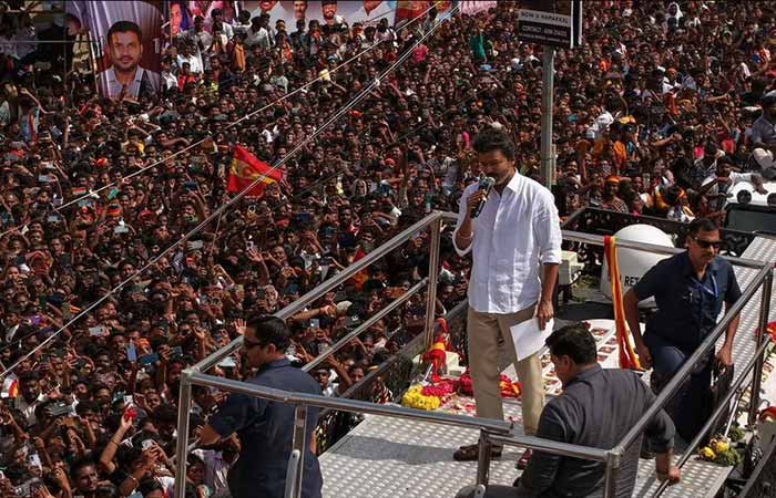 એફઆઇઆરમાં ટીવીકે ચીફ વિજય અને તેમના પાર્ટીના ત્રણ અન્ય નેતાઓને આ દુર્ઘટના માટે જવાબદાર ઠેરવવામાં આવ્યા છે. પોલીસે ટીવીકેના જિલ્લા સચિવ મથિયાઝગન, રાજ્ય મહાસચિવ બુશી આનંદ અને રાજ્ય સંયુક્ત સચિવ સીટીઆર નિર્મલકુમારની વિરુદ્ધ ભારતીય ન્યાય સંહિતાની કલમ 105, 110, 125, (બી)223 અને તમિલનાડુ જાહેર સંપત્તિ કાયદાની કલમ ૩ હેઠળ કેસ દાખલ કરવામાં આવ્યો છે. એફઆઇઆરમાં જણાવવામાં આવ્યું છે કે વિજયની રેલી માટે 11 શરતો નક્કી કરવામાં આવી હતી. સુરક્ષા અને ટ્રાફિકની વ્યવસ્થા માટે 500 પોલીસ કર્મીઓ તૈનાત કરવામાં આવ્યા હતાં. એફઆઇઆરમાં જણાવવામાં આવ્યું છે કે મીડિયામાં વિજયને બપોરે 12 વાગ્યે રેલીમાં આવવાની જાહેરાત કરી હતી. જો કે સવારે 10 વાગ્યાથી જ ભીડ જમા થવા લાગી હતી. મથિયાઝનને 10,000 લોકો માટે પરવાનગી માંગી હતી. જો કે 25,000થી વધુ લોકો એકત્ર થઇ ગયા હતાં. એફઆઇઆરમાં આરોપ મૂકવામાં આવ્યો છે કે વિજય ઇરાદાપૂર્વક રેલીમાં મોડા પહોંચ્યા હતાં.