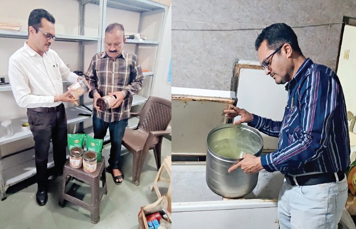 વિશાલ ઘૂઘરા, સોનુ ઘૂઘરા, સીતારામ છોલે ભટુરે, જય સોમનાથ ઘૂઘરા, શ્રી રામદેવ ભેળ, પ્રકાશ ઘૂઘરા, જય માતાજી છોલે ભટુરે, અમરનાથ ડેરી ફાર્મ, શિવશક્તિ ઘૂઘરા, હરિ ભોજનાલય, જૈનીલ ડાઈનીંગ હોલ, ગણેશ મદ્રાસ કાફે અને એટુઝેડ ઘૂઘરા સહિતનાને લાઈસન્સ મેળવવા બાબતે સૂચના આપવામાં આવી હતી, તથા ભુરાભાઈ રગડાવાળા, ક્રિષ્ના ઘૂઘરા, લલિતભાઈ ચાટવાલા, ક્રિષ્ના છોટેભટુરે, મની મદ્રાસ કાફે, જય મોમાઈ છોલેભટુરે, બોમ્બે વડાપાઉં, શક્તિકૃપા દાળ પકવાન, શક્તિ કોલ્ડ્રિંક્સ, રામભાઈ રગડાવાળા, સનમ ભૂંગળા બટેટા, સંતોષ નાસ્તા હાઉસ, મારુતિ ગાંઠીયા, શ્રદ્ધા શોપિંગ સેન્ટર, ગોકુલ સ્નેક્સ, પીઝા સ્ટુડીયો, એચ. એન. એન્ટરપ્રાઈઝ, રામવિજય ડ્રાયફ્રુટ, ઢોસા બાઈટ, બાબુભાઈ રગડાવાળા, હરિઓમ ઢોસા, સંતોષ ભેળ, શિવાંશી પાણીપુરી, બાલાજી સાઉથ ઈન્ડિયન, કાકા સોડા શોપ, જય દ્વારકાધીશ ટી સ્ટોલની ચકાસણી કરવામાં આવી હતી.,ફૂડ સેફ્ટી સ્ટાન્ડર્ડ એક્ટ 2006 હેઠળ કુલ 4 ખાદ્ય ચીજવસ્તુઓના નમૂના લેવામાં આવ્યા હતા, જેમાં રસમલાઈ ગોલ્ડ દેશી ગોળ (800 ગ્રામ પેક્ટ), ઝાહીદી ડાયટ (500 ગ્રામ પેક્ડ), નેચરલ્સ ચોઈસ રોયલ ફાડ ડાયસ (500 ગ્રામ પેક્ડ) અને ઈમ્પેરેર ડાયટ ઝાહીદી ડાયટ રિલાયન્સ રિટેલ લિમિટેડ નાના મવા ચોક પાસે 150 ફૂટ રીંગ રોડથી નમૂના લેવામાં આવ્યા હતા.