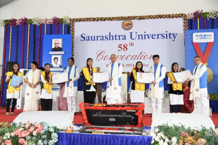રાજકોટ ખાતે રાજયપાલ શ્રી આચાર્ય દેવવ્રતજીના અધ્યક્ષસ્થાને સૌરાષ્ટ્ર યુનિવર્સિટીનો 58 મો પદવીદાન સમારોહ યોજાયો હતો. રાજ્યપાલશ્રી આચાર્ય દેવવ્રતજીએ સૌરાષ્ટ્ર યુનિવર્સિટીના 58મા પદવીદાન સમારોહમાં દીક્ષાંત પ્રવચનમાં યુવા છાત્રોને કોલેજ શિક્ષણ દ્વારા જે જ્ઞાન પ્રાપ્ત કર્યું છે તે માત્ર સ્વઉત્કર્ષ માટે જ નહીં, પણ લોકકલ્યાણ અને રાષ્ટ્રના નિર્માણ માટે પણ ઉપયોગી થાય તેવો પુરૂષાર્થ કરવા આહ્વાન કર્યું હતું. ઉચ્ચ શિક્ષણ મંત્રી ઋષિકેશભાઈ પટેલે જણાવ્યું કે, શિક્ષણ વ્યક્તિગત કારકિર્દી માટે જ પૂરતું નથી. માનવ કલ્યાણ-રાષ્ટ્ર હિતનો ભાવ પણ તેમાં રહેલો હોય છે.