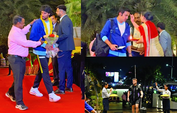 મેચના બે દિવસ પહેલા એટલે કે 26 જાન્યુઆરીને રવિવારના રોજ બંને ટીમના ખેલાડીઓનું રાજકોટમાં આગમન થયું છે, જેમાં ટીમ ઇન્ડિયાના ખેલાડીઓ કાલાવડ રોડ પર હોટેલ સયાજી ખાતે રોકાણ કરવાની છે જયારે ઇંગ્લેન્ડ ટિમ 150 ફૂટ રિંગ રોડ પર આવેલ હોટલ ફોચ્ર્યુન ખાતે રોકાશે. ભારતીય ખેલાડીઓનું રેડ કાર્પેટ પર તિલક કરી બુકે આપી હાર પહેરાવી કાઠિયાવાડી ઠાઠમાં સ્વાગત કરવામાં આવ્યું હતું. જેમાં સયાજી હોટલ ખાતે કેપટન સૂર્ય કુમાર યાદવ, હાર્દિક પંડ્યા, તિલક વર્મા, સંજુ, અર્શદીપ, અક્ષર પટેલ સહીત તમામ ખેલાડીઓની સાથે સાથે ટીમના કોચ ગૌતમ ગંભીર, સિતાંશુ કોટક, અને સપોર્ટિંગ સ્ટાફનું પણ સ્વાગત કરવામાં આવ્યું હતું.
