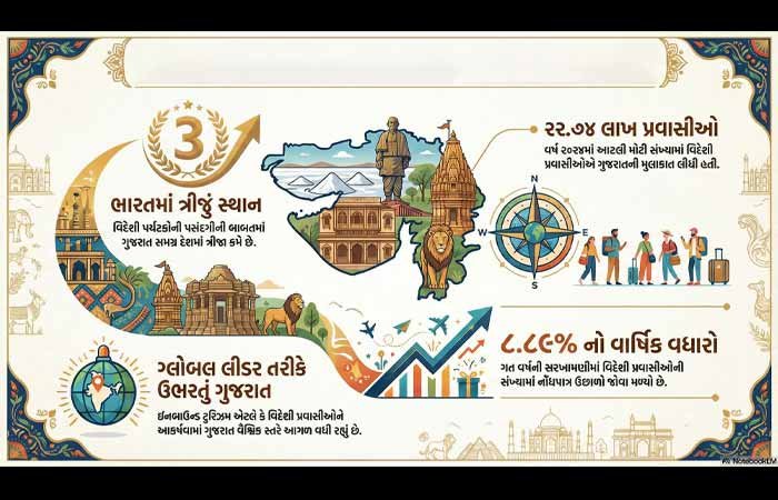 વદેશી પર્યટકો માટે ગુજરાત સતત આકર્ષણનું કેન્દ્ર બની રહ્યું છે. પર્યટન ક્ષેત્રે રાજ્યએ વૈશ્વિક ફલક પર પોતાની અલગ ઓળખ ઉભી કરી છે. કેન્દ્રીય પર્યટન મંત્રાલય દ્વારા જાહેર કરાયેલા ઇન્ડિયા ટુરિઝમ ડેટા કમ્પેન્ડિયમ-2025 અનુસાર, વર્ષ 2024 દરમિયાન ગુજરાત દેશમાં વિદેશી પ્રવાસીઓ દ્વારા ત્રીજા ક્રમે સૌથી વધુ મુલાકાત લેવાયેલું રાજ્ય બન્યું છે. અહેવાલ મુજબ, 2024માં દેશમાં કુલ 2 કરોડ 5 લાખ 70 હજાર વિદેશી પર્યટકો આવ્યા હતા, જે અગાઉના વર્ષની સરખામણીમાં 8.89 ટકાનો નોંધપાત્ર વધારો દર્શાવે છે. આ સમયગાળા દરમિયાન વિદેશી પ્રવાસીઓની મુલાકાત માટેના ટોચના પાંચ રાજ્યોમાં મહારાષ્ટ્ર, પશ્ચિમ બંગાળ, ગુજરાત, ઉત્તર પ્રદેશ અને રાજસ્થાનનો સમાવેશ