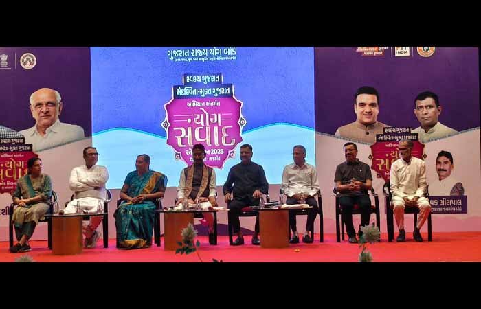 ગુજરાત રાજ્ય યોગ બોર્ડ દ્વારા રાજકોટ ખાતે તા. 22 નવેમ્બર, 2025ના રોજ હેમુ ગઢવી હોલ ખાતે ’યોગ સંવાદ અને યોગ સ્નેહ મિલન’ કાર્યક્રમનું સફળતાપૂર્વક આયોજન કરવામાં આવ્યું હતું. રાજ્યના નાગરિકોને સ્વસ્થ જીવનશૈલી પૂરી પાડવાના ઉદ્દેશ્યથી 2019માં સ્થપાયેલા આ બોર્ડ અંતર્ગત હાલમાં રાજ્યમાં 1,53,000 ટ્રેનર્સ દ્વારા 5000થી વધુ નિ:શુલ્ક યોગ કક્ષાઓ કાર્યરત છે.