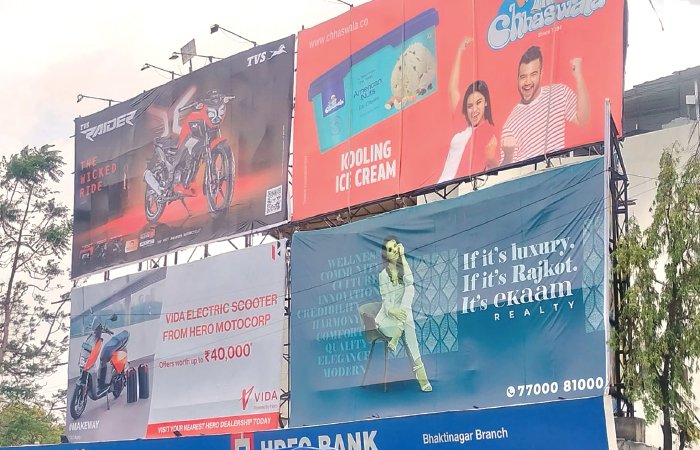 રાજકોટમાં જાણે હોર્ડિંગ્સનો મેળો લાગ્યો હોય તેવું જોવા મળે છે. જગ્યાએ-જગ્યાએ મોટા મોટા બેનરો લટકાવવામાં આવ્યા છે જેના લીધે સામાન્ય જનતાને ત્યાંથી પસાર થવામાં ભય લાગતો હોય છે. ચોમાસાના આગમન પૂર્વે આ બેનરો લટકતા જોવા મળે છે ત્યારે ચોમાસાના આગમન પછી આવા મોટા મોટા બેનરો વરસાદી વાતાવરણમાં ફુંકાતા પવનના લીધે ઘણી વખત ઊડીને દૂર ફેંકાઈ જતાં હોય છે અને ઘણી વખત અવરજવર કરતાં લોકોને ઈજા પહોંચાડતા હોય છે.