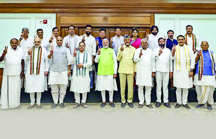 એનડીએની મીટીંગમાં ટીડીપી નેતા ચંદ્રાબાબુ નાયડુ, જેડીયુ નેતા અને બિહારના મુખ્યમંત્રી નિતીશકુમાર, મહારાષ્ટ્રના મુખ્યમંત્રી એકનાથ શિંદે, એલજેપી (પાસવાન) પ્રમુખ ચિરાગ પાસવાન સહિત ભાજપ અને સાથી પક્ષોના ર1 નેતાઓ સામેલ થયા હતા. આ પહેલા વડાપ્રધાન મોદીની અધ્યક્ષતામાં વડાપ્રધાન આવાસમાં કેન્દ્રીય કેબીનેટની બેઠક થઇ હતી અને વર્તમાન લોકસભાને ભંગ કરવાની ભલામણને મંજૂર કરવામાં આવી હતી. સુત્રોએ જણાવ્યું હતું કે, કેબીનેટ મીટીંગમાં મોદીએ એવું કહ્યું કે, જનાદેશ મળ્યા બાદ ત્રીજી ટર્મમાં પણ સરકાર પહેલી બે ટર્મની જેમ જ ચાલશે. સાથે જ એવો વિશ્ર્વાસ દર્શાવ્યો કે અગાઉની જેમ જ સરકાર કામ કરતી રહેેશે. સરકારમાં ટીડીપી અને જેડીયુ કેટલાક મહત્વના વિભાગો માંગી શકે છે. કારણ કે સરકારની રચનામાં તેમની મુખ્ય ભૂમિકા છે.