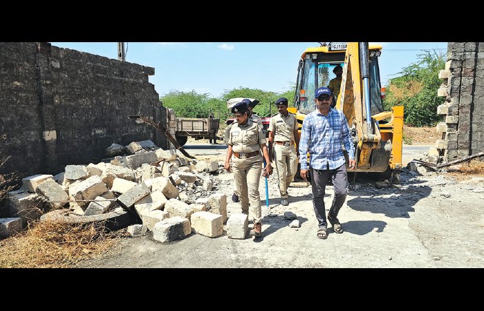 જે સ્થળે તાલુકા પોલીસ સહિતના પોલીસની વિવિધ ટીમો દ્વારા ચુસ્ત બંદોબસ્ત સાથે જેસીબી વડે સ્થળ પર પહોંચ્યા હતા.અને મહાપાલિકાની ટીમને સાથે રાખીને અહીં 1100 ચોરસ ફૂરનું ગેરકાયદે બાંધકામ તોડી પાડીને જેની બાજુમાંથી નીકળતો જાહેર માર્ગ ખુલ્લો કરવામાં આવ્યો હતો. તે તમામ બેલાઓ સાથેનો મુદ્દામાલ પોલીસે કબજે કર્યો છે. અને ગેરકાયદે બાંધકામ દુર કરવાની કામગીરી કરી હતી.