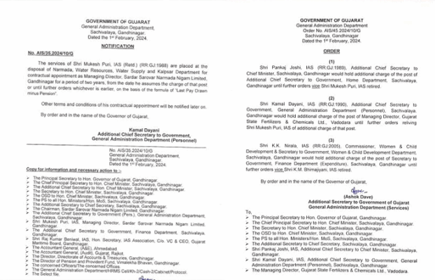 કમલ દયાનીને GSFCના MDનો ચાર્જ સોંપાયો છે. જ્યારે કે.કે.નિરાલાને નાણાં વિભાગના સચિવ બનાવાયા છે. આ સાથે જ IAS કે.કે.નિરાલા વધારાનો હવાલો સંભાળશે. આ સિવાય ગૃહ વિભાગમાંથી અધિક મુખ્ય સચિવ પદે નિવૃત્ત થયેલા મુકેશપુરીને નિમણૂંક અપાઈ છે.