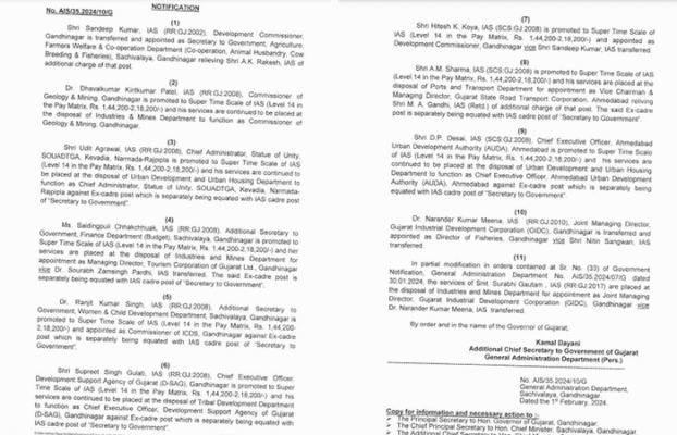 IAS સંદીપ કુમાર, વિકાસ કમિશનર ગાંધીનગરની બદલી કૃષિ, ખેડૂત કલ્યાણ અને સહકાર વિભાગ (સહકાર, પશુપાલન, ગાય સંવર્ધન અને મત્સ્યોદ્યોગ)ના સચિવ તરીકે નિમણૂક કરવામાં આવી છે. જે ચાર્જ વર્તમામાં એ.કે. રાકેશ પાસે હતો. ઉદિત અગ્રવાલ, મુખ્ય વહીવટકર્તા, સ્ટેચ્યુ ઓફ યુનિટી, કેવડિયા, નર્મદા-રાજપીપળાને IASના સુપર ટાઈમ સ્કેલમાં બઢતી આપવામાં આવી છે અને તેમની સેવાઓ શહેરી વિકાસના નિકાલ પર ચાલુ રાખવામાં આવી છે અને અર્બન હાઉસિંગ ડિપાર્ટમેન્ટ મુખ્ય વહીવટકર્તા, સ્ટેચ્યુ ઓફ યુનિટી, કેવડિયા, નર્મદા- રાજપીપળા તરીકે ભૂતપૂર્વ કેડર પોસ્ટ સામે કાર્ય કરશે જે અલગથી સરકારના સચિવની IAS કેડર પોસ્ટ સાથે સમકક્ષ કરવામાં આવે છે. જે સહિત 14 અધિકારીઓને વિવિધ હોદ્દો સાથે બદલી કરાઈ છે.