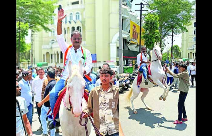 રાજકોટમાં આગામી સ્થાનિક સ્વરાજ્યની ચૂંટણીઓને લઈને રાજકીય માહોલ બરાબર જામ્યો છે ત્યારે આજે કોંગ્રેસના વોર્ડ નં-8ના ઉમેદવાર રણજીત મુંધવાએ અનોખી રીતે ઉમેદવારી ફોર્મ ભરવા ગયા હતા. રણજીત મુંધવાએ આજે સમર્થકો સાથે ઘોડા પર બેસીને મનપાની ચૂંટણીનું ફોર્મ ભર્યું હતું અને ચૂંટણીમાં જંગી બહુમતીથી વિજય થશે તેવો વિશ્ર્વાસ વ્યક્ત કર્યો હતો. આજે ઉમેદવારી ફોર્મ ભરવાના અંતિમ દિવસોમાં વોર્ડ નંબર 8 ના કોંગ્રેસના ઉમેદવાર રણજીત મુંધવાએ એક અનોખા શક્તિ પ્રદર્શન સાથે પોતાની ઉમેદવારી નોંધાવી હતી. રણજીત મુંધવા જામનગર રોડ પર આવેલ સરવે ભવન ખાતે ઘોડા પર સવાર થઈને ફોર્મ ભરવા પહોંચ્યા હતા. આ પ્રસંગે માધ્યમો સાથે વાત કરતા તેમણે જણાવ્યું હતું કે, ‘જેમ યુદ્ધના મેદાનમાં ઘોડા પર સવાર થઈને જવાય છે, તેમ અમે પણ લોકોના પ્રશ્ર્નો માટે લડવા આ ચૂંટણી મેદાનમાં ઉતર્યા છીએ.’