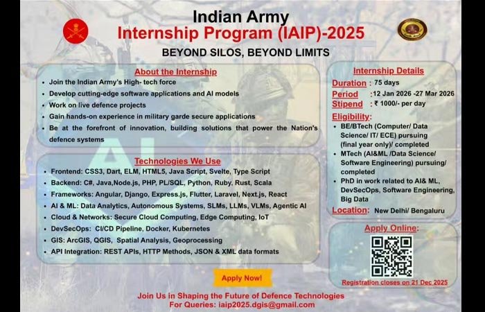 ભારતીય સેના તરફથી એન્જિનિયરિંગ અને રિસર્ચ સાથે જોડાયેલા વિદ્યાર્થીઓ માટે એક ખાસ અને આધુનિક ઇન્ટર્નશિપ કાર્યક્રમ માટે +અરજીઓ મંગાવી છે, જેનું નામ ભારતીય સેના ઇન્ટરન્શીપ કાર્યક્રમ છે. તેનો હેતુ યુવાનોને નવી ટૅક્નોલૉજી સાથે જોડવું અને દેશની રક્ષા સાથે જોડાયેલી મુખ્ય યોજનાઓ પર કામ કરવાની તક આપવાનો છે. જે પણ ઉમેદવાર આ ખાસ ઇન્ટર્નશીપમાં ભાગ લેવા ઇચ્છે છે તે 21 ડિસેમ્બર, 2025 સુધી ઓનલાઇન અરજી કરી શકે છે. આ પહેલનું નામ Beyond Silo, Beyond Limits રાખવામાં આવ્યો છે. જેનો અર્થ છે સીમાઓથી આગળ જઈને શીખવું.