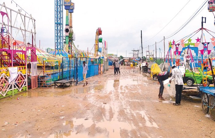ભારે વરસાદ સાથે ફૂંકાતા પવનના લીધે બેનરો ઉડ્યા, લોકમેળામાં પાણી ભરાયાં