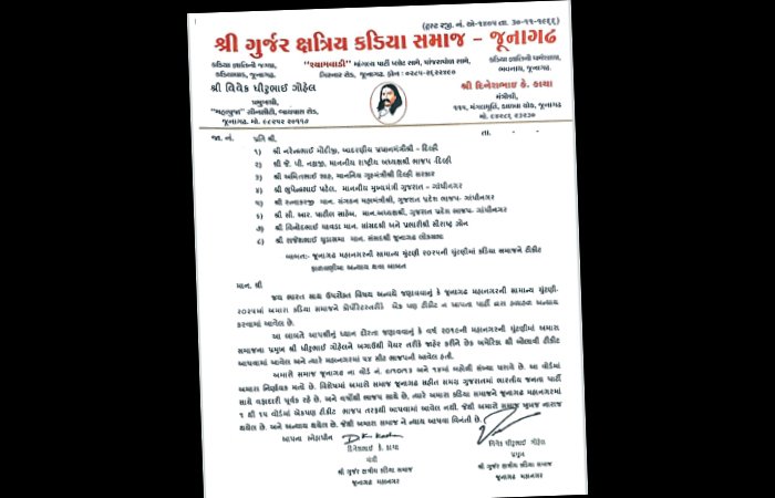 આ અંગે જૂનાગઢ ગુર્જર ક્ષત્રિય કડીયા સમાજના આગેવાનોએ વડાપ્રધાન, મુખ્યમંત્રી, ભાજપના રાષ્ટ્રીય અને પ્રદેશ અઘ્યક્ષ, પ્રભારી સહિતનાઓને પત્ર દ્વારા નારાજગી વ્યકત કરવામાં આવી છે.