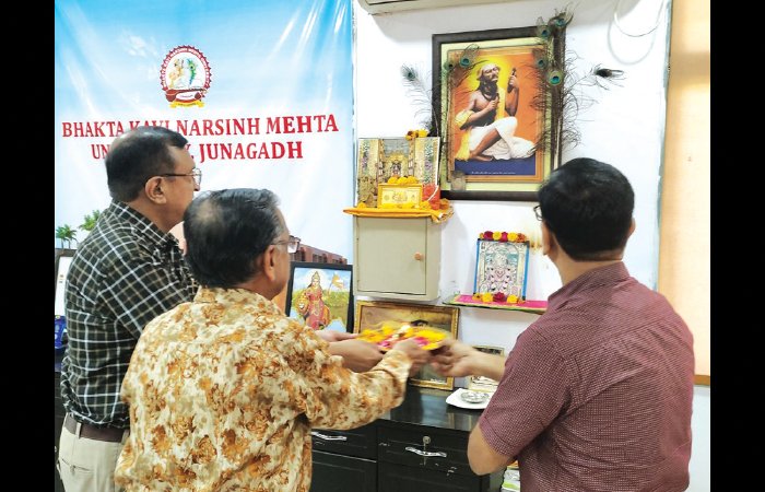 યુનિ.નાં રજીસ્ટ્રાર ડો. મયંક સોનીએ ભાવવંદનામાં જણાવ્યુ હતુ કે જૂનાગઢને કર્મભૂમિ બનાવનાર આ ભક્તકવિએ સાહિત્યિક ગૌરવ પ્રદાન કર્યું છે. ગુજરાતી ભક્તિ સાહિત્યમાં પોતાની અમીટ છાપ છોડી જનાર આ ભક્તકવિની રચનાઓ મોટેભાગે ઝૂલણા છંદમાં જોવા મળે છે. ગાંધીજીને પ્રિય એવું વૈષ્ણવ જનતો તેને રે કહીએ જે પીડ પરાઈ જાણે રે, પરદુ:ખે ઉપકાર કરે તોયે મન અભિમાન ના આણે રે. જેવું માનવતાના સાચા લક્ષણો દર્શાવતું ભજન નરસિંહ મહેતાએ આ જગતને આપેલી અણમોલ શીખ છે. માત્ર ભજનની બેજ પંક્તિઓમાં આટલી સહજતાથી લોકોને જીવનનો ખરો બોધ આપી ગયા છે.