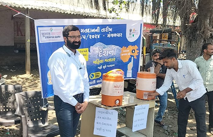 લોકસભા સામાન્ય ચૂંટણીમાં દરેક મતદાતા મતાધિકારનો ઉપયોગ કરી લોકશાહીના મહાપર્વમાં સહભાગી બને તે માટે જરૂરી સંદેશ આપવામાં આવી રહ્યો છે. આમ, હિતવેવથી બચવા માટે પાણી પીવું જરૂરી છે, સાથે જ લોકશાહીમાં મતદાન અવશ્ય કરવું જરૂરી છે.તદ ઉપરાંત મતદાન જાગૃતિ અર્થે બેનર પણ લગાવવામાં આવ્યા છે. તેમજ આ પાણીના પરબ ચલાવવા અને મતદાન જાગૃતિનો સંદેશ આપવા માટે સ્થાનિક સ્વયં સેવકો ઉપરાંત તલાટી મંત્રી અન્ય કર્મચારી-અધિકારી પણ જહેમત ઉઠાવી રહ્યા છે.
